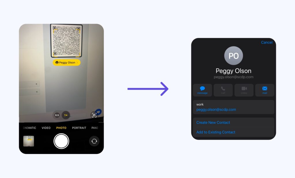 کیوآر کدها میتوانند به عنوان کارت ویزیت دیجیتال عمل کنند. با اسکن یک کیوآر کد، اطلاعات تماس شخص به طور مستقیم در گوشی هوشمند ذخیره میشود. این کاربرد به ویژه در کنفرانسها و نمایشگاهها بسیار محبوب است.
